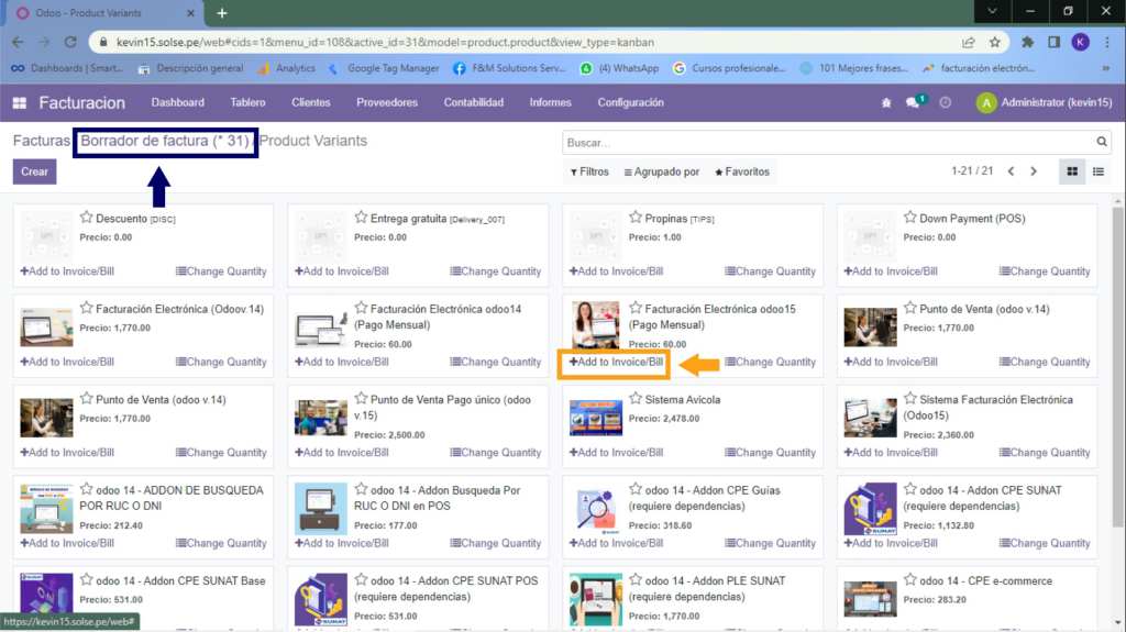 A) Clic en “+add Products” y elegimos los productos luego clic en “borrador de factura” para regresar a la factura.