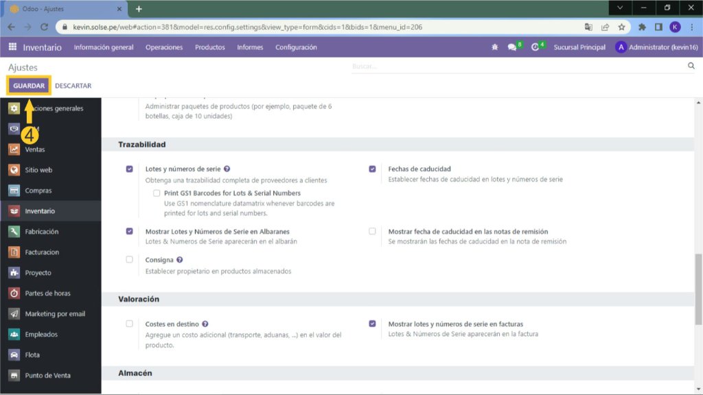 3) Marcamos con un check "Lotes y números de serie", "Mostrar Lotes y Números de serie en Albaranes" y "Fechas de caducidad".