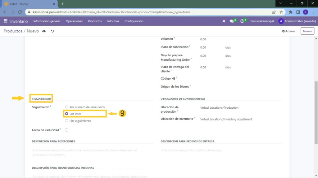 9) Luego nos dirigimos a trazabilidad y marcamos "Por Lotes".