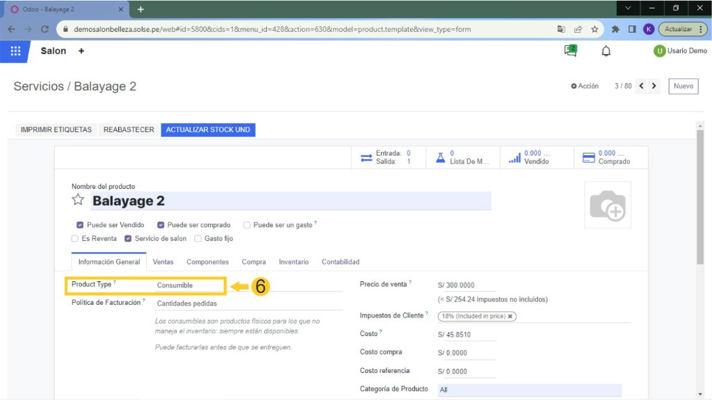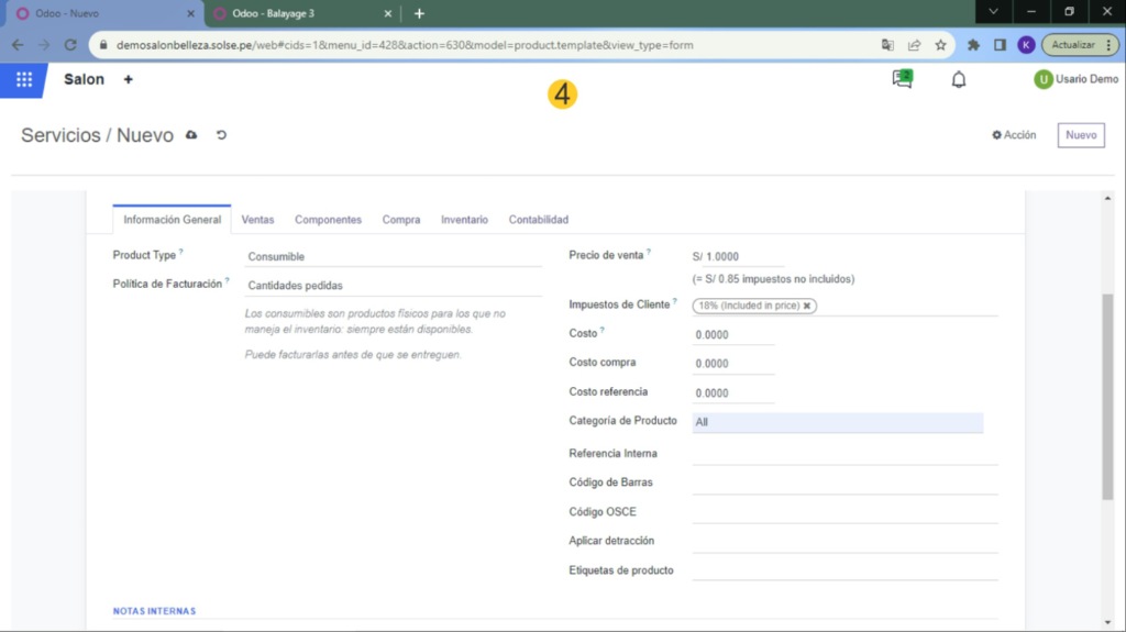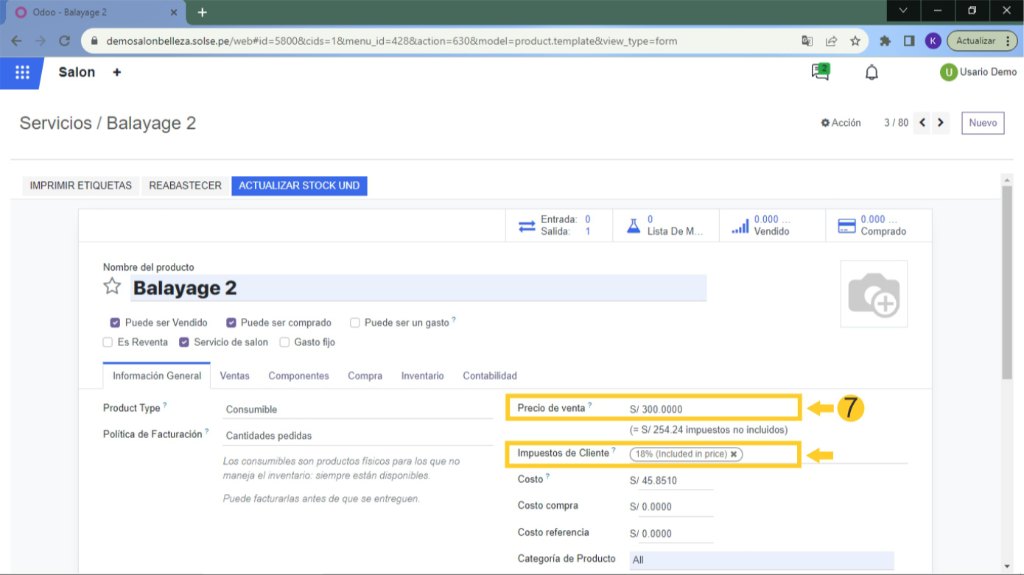 7) En el campo "Precio de venta" colocamos el precio del servicio y también colocamos el impuesto que elijamos.